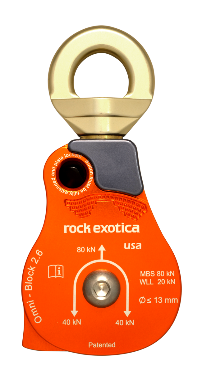The Omni-Block combines a swivel and pulley into one tool, and incorporates a unique sideplate that opens while the pulley is still attached to the anchor. Traditionally, a pulley is connected to a swivel by a carabiner. However, the Omni eliminates the need for the carabiner, reducing length and pieces of equipment in the rigging system. The short length of the Omni is important when used in high-angle, confined space or other space-sensitive rigging environments. The reduced weight of the Omni will make hauling your gear easier. Additionally the Omni sideplate can be opened without detaching from the carabiner. Traditional pulleys require removing from the carabiner to change the rope. With the Omni, the user is able to do this while the pulley is still secured.