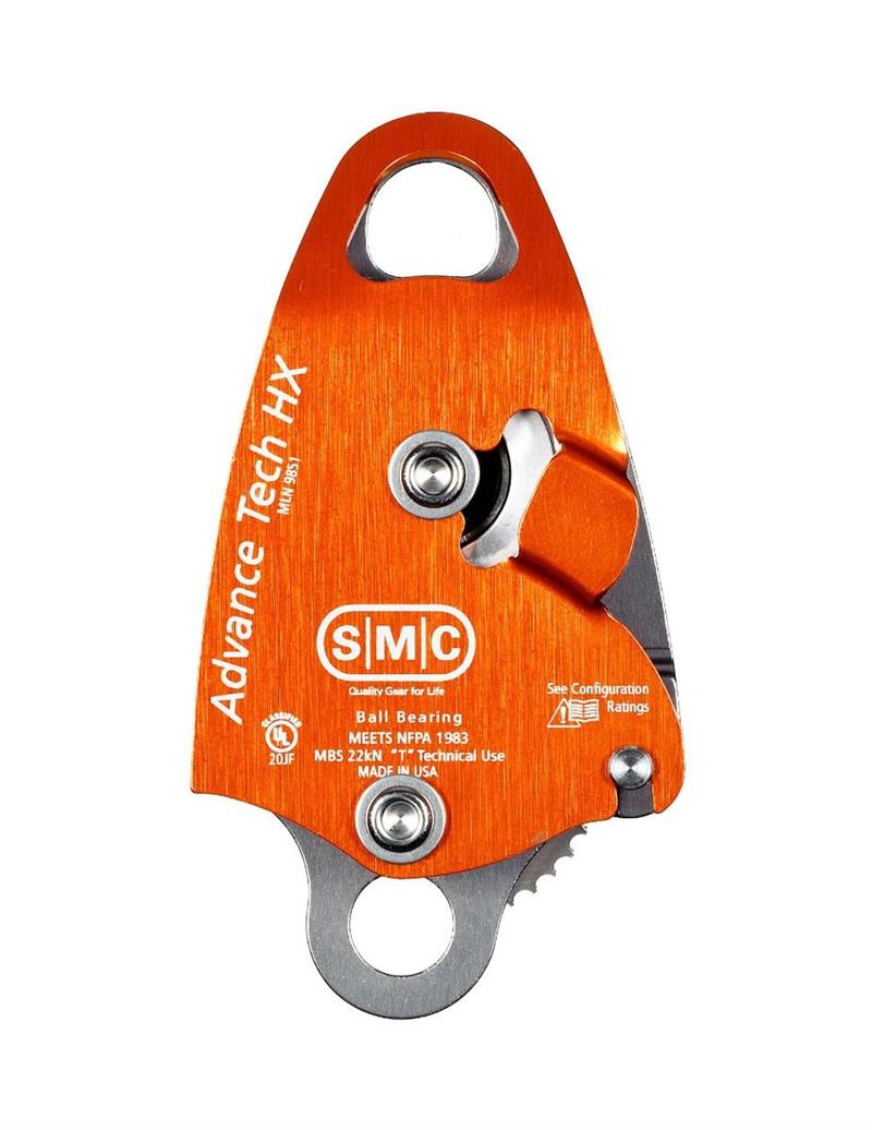 The SMC Advance Tech HX Pulley is a double pulley with an integrated cam that provides immediate progress capture without needing prusik loops. The all-in-one frame and cam design present a compact form factor. Stainless pins retain the rope when a rigged system is packed so that system can be pulled out and used immediately. Manufactured from high-quality aluminum and anodized to help prevent corrosion. The Advance Tech HX is the most advanced pulley on the market today. The Advance Tech HX will support rope diameters from 7mm up to 12.5mm. The Advance Tech HX is ideal for all rescue applications with a small mechanical advantage system. FEATURES AND BENEFITS: Integrated Cam for progress capture without the need for prusiks. High-efficiency sealed ball bearings providing flawless function under conditions that would shut down lesser-grade pulleys.Side plates are precisely tensioned for easy one-handed operation and secure placement at any point along the rope. Low-profile fasteners reduce snagging and hanging up when moving the pulley.Wide base design works most efficiently with Prusik cords of up to 8mm.Made in the USAHaul System Strength: Cam Rating 4:1 Haul System Strength - Typical 4:1 system rigged using the Advance Tech HX with cam engaged on the 4th leg and standard double Pulleys. The system utilized the becket on the Advance Tech HX Pulleys. The system was pulled end to end using carabiner holes. 7mm: 2,000 lbf. (8.9kN)9mm: 2,500 lbf. (11.1kN)12.5mm: 4,500 lbf. (20kN)
