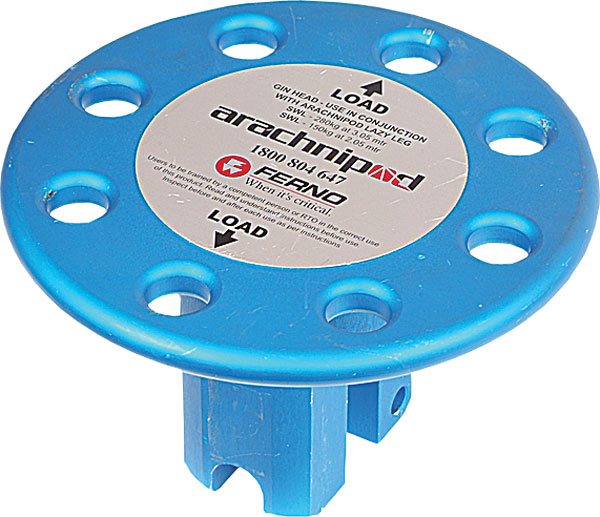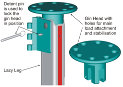 The gin head is used with a lazy leg to form a gin pole. Both parts are colored blue making the leg selection an easy task. Before connecting the gin head the head on the lazy leg must be rotated 180.The gin head is then inserted into the lazy leg tube and locked into position with a detent pin.