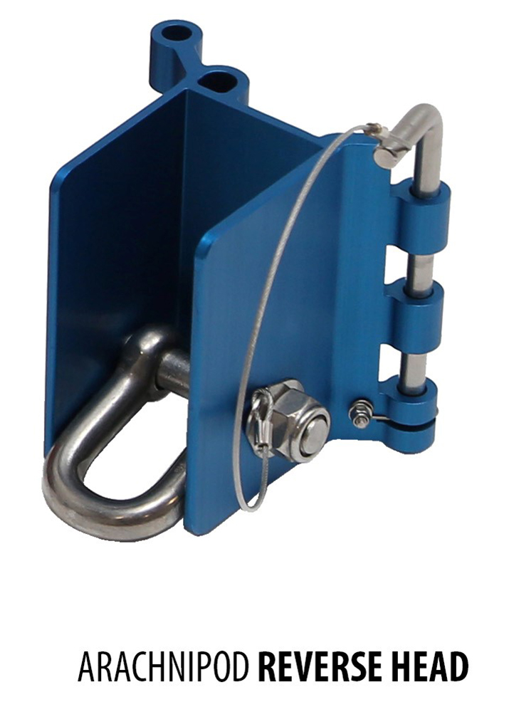 A reverse head is used to change the angle between legs. The diagram (above) shows the angles. The use of a reverse head and a quad plate is recommended when constructing a lazy leg tripod. When using a reverse head and whenever possible, loads should be attached to the large D-shackle to centralise the load between the two opposing legs.
