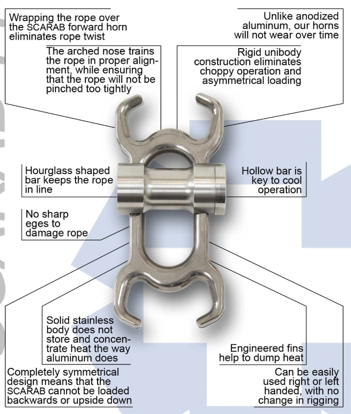 Superior Control vs. CompetitionThe Scarab® represents five years of research and testing. It was born out of the need for a small, simple device that could easily control heavy rescue loads and excel at pick-offs, twin rope systems, and other general rescue techniques. The Scarab® does all this and more. With two models available, the Scarab® is the perfect choice for both Fire/Rescue and backcountry rescue environments. The Scarab has endured over five years of drop and slow pull testing and extensive heat and wear studies utilizing Conterra's Capstan Test Bed. The frame and crossbars strength is greater than 40kN. In real-world tests with Nylon rescue ropes, the ropes fail at the nose of the Scarab® at about their knotted strength (just like most other descent control devices). When pulling a 12.7mm rescue rope on a tied-off Scarab®, the rope breaks at about 27kN, easily exceeding the 22kN NFPA G requirement for descent control devices. In addition to a battery of slow pull and drop tests, the ScarabÃî has undergone extensive heat and wear studies. One device was tested by pulling over a mile of dirty rope through it under rescue-sized tension, with temperature reading thermocouples being monitored at several locations during pulls. At 2kN of tension and a lowering speed of 10M per minute, the Scarab® maintained a frame temperature of about 100 degrees C. To our knowledge, the Scarab® is the only descent control device tested to this degree. Incredibly strongli>Does not twist the rope Instantly adjustable friction (wrap a horn)Lower 600 lb loads with two fingersSuper easy lock offEasy to use, right or left handedSingle and double rope capableAttach rope without unclipping from anchorWARNINGThis product can expose you to chemicals including nickel acetate which is known to the State of California to cause cancer. For information go to: www.p65warnings.ca.govt