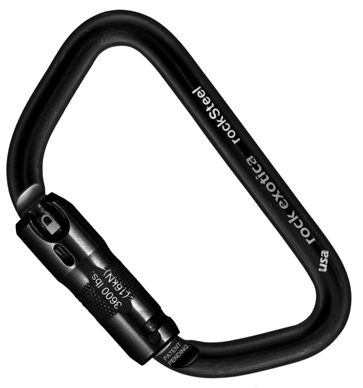 Super-strong DThe rockSteel offers a surprising strength-to-weight ratio in a carabiner of its capacity. Most steel carabiners are made from 1/2 diameter steel. We use a lighter, 7/16 diameter steel that is heat treated for added strength.Like the Rock Exotica aluminum carabiners, the Rocksteel frames are CNC machined for precise fittings and exact tolerances. The result is a carabiner with a high strength-to-weight ratio, keylock snag-resistant nose and a feel like no other steel carabiner in the world.The gate/sleeve is rated at 16kN or 3600 lbs, to protect against inward force against gate. The rockSteel carabiner is ANSI Z359.12 (09) and NFPA G compliant. MBS: 50 kN (11,240 lbf) Gate Opening: 30mm (1.2") Dimensions: 125 x 75mm (4.9" x 2.95") Weight: 246 gm (8.8 oz.) Certification: ANSI Z359, NFPA 'G'WARNINGThis product can expose you to chemicals including nickel acetate which is known to the State of California to cause cancer. For information go to: www.p65warnings.ca.govt